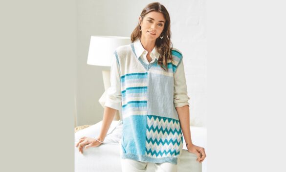 Пестрый коллаж: этот жилет создан для тех, кто любит разнообразие! Обе половинки переда и спинки отличаются друг от друга дизайном: здесь в определенном порядке чередуются цветные полосы, зигзаги и однотонные участки лицевой глади. Края боковых разрезов отделаны полым шнуром.
