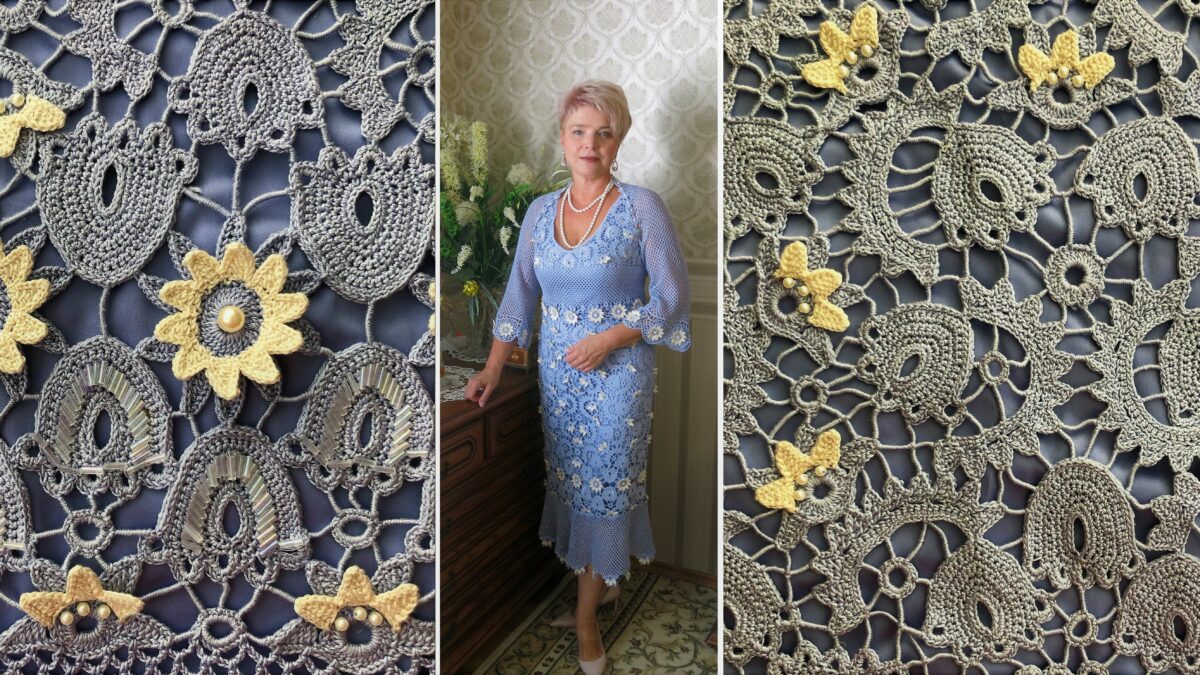 Голубое нарядное платье в смешанной технике ирландского и румынского кружева.
