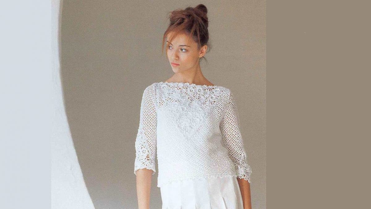 Блузка с треугольными вставками на полочке и рукавах 3/4 выполнена в технике ирландского кружева.