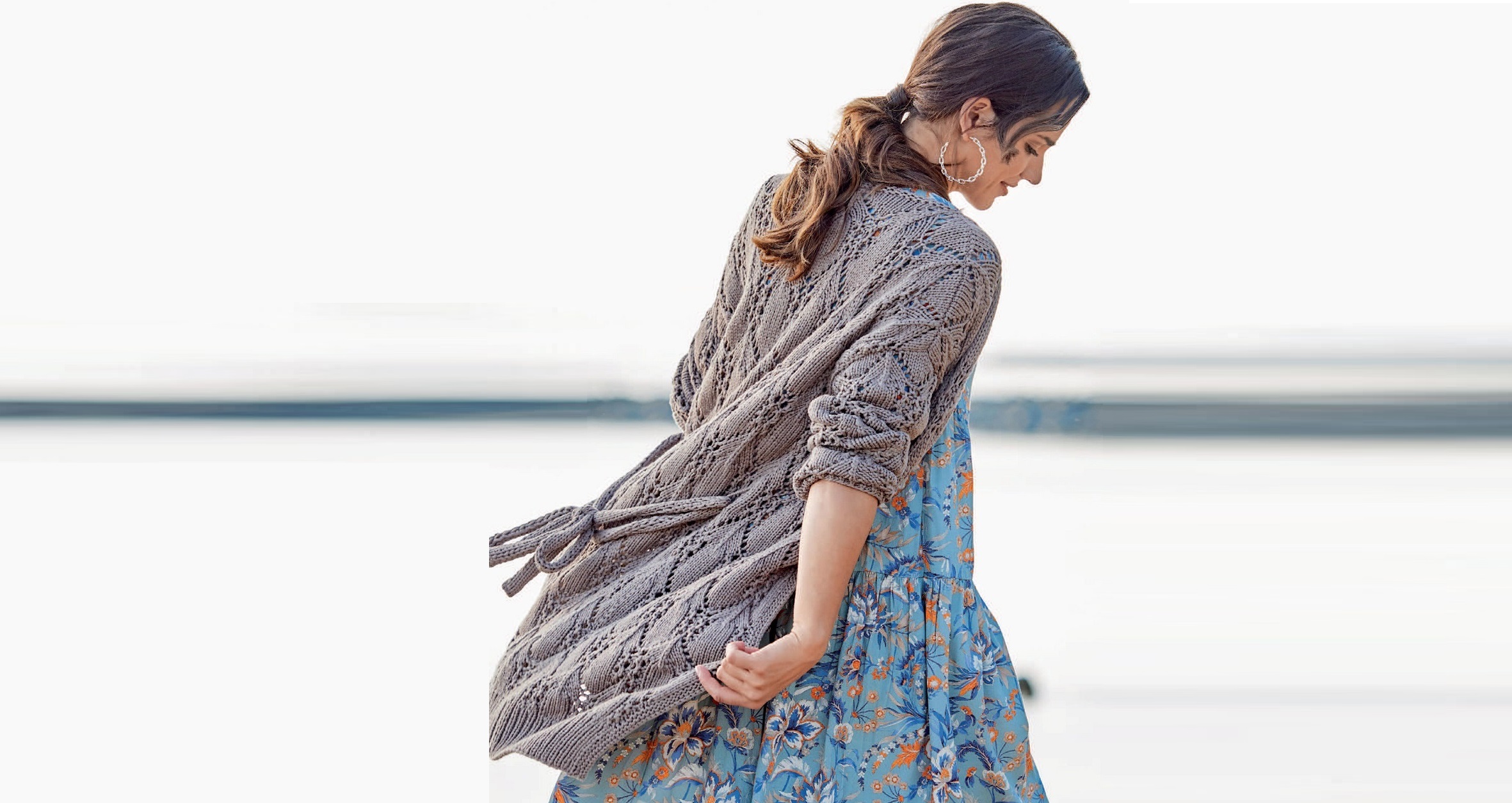 Длинный свободный кардиган с фантазийным ажурным узором связан спицами из хлопка с кашемиром и модала.