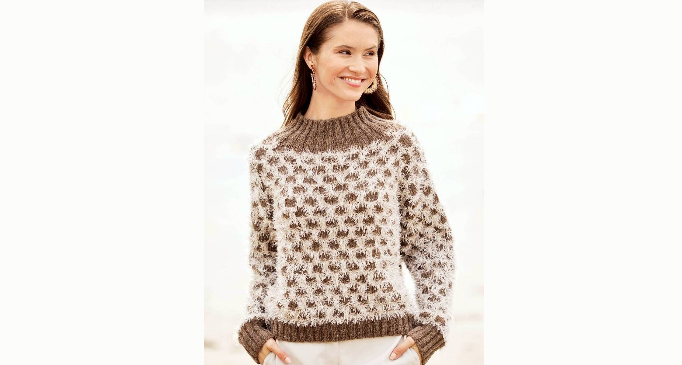 Так и хочется погладить симпатичный пуловер, удачно сочетающий ворсистую пряжу с объемным узором из снятых петель!