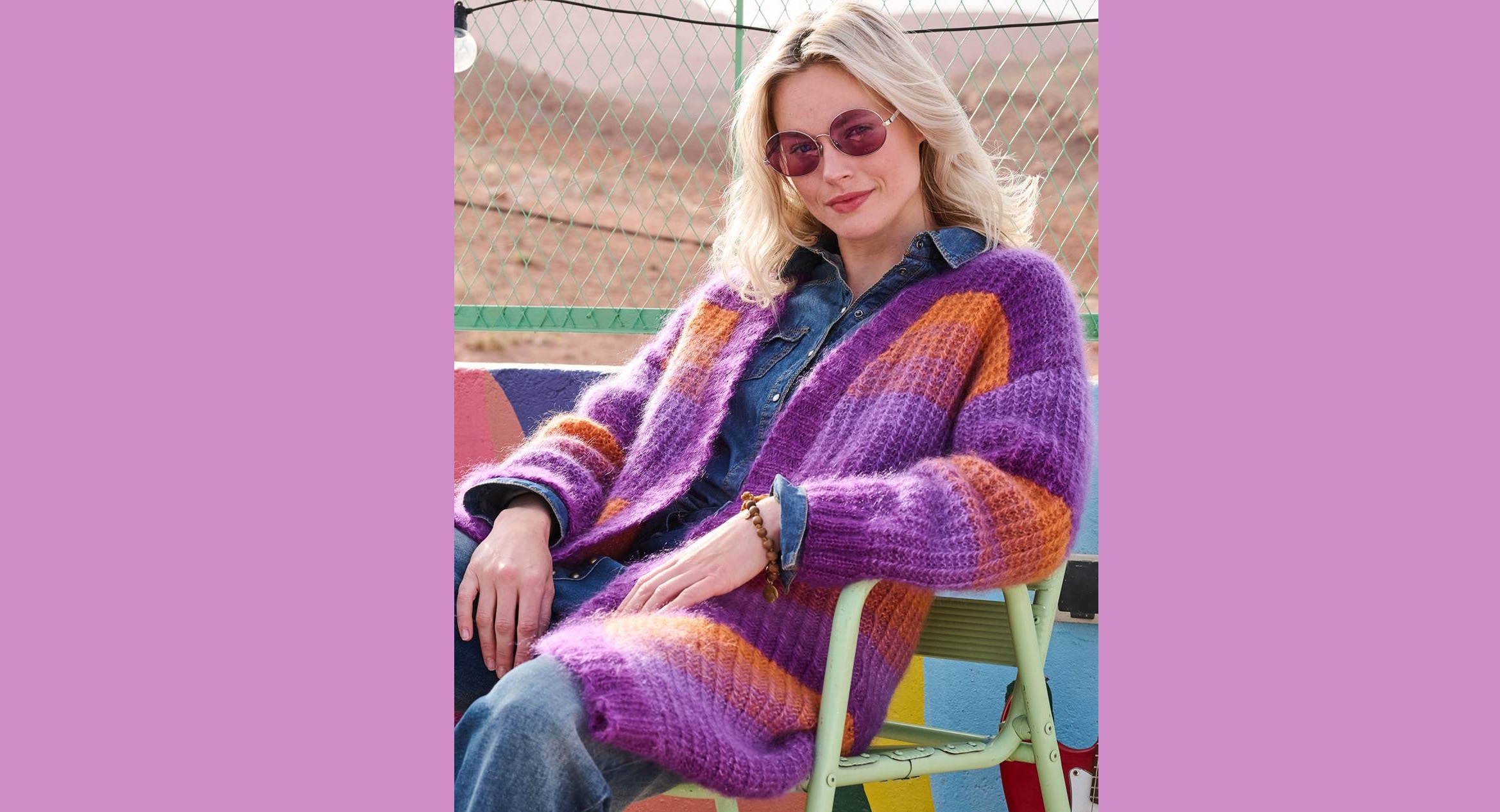 Тон здесь задают оранжевый, лиловый и сиреневый: они плавно переходят друг в друга за счет вязания в три нити с последовательной сменой одного цвета. Благодаря точной инструкции даже новички справятся с этой задачей, тем более что структурный узор и планки в резинку тоже не требуют особых усилий.