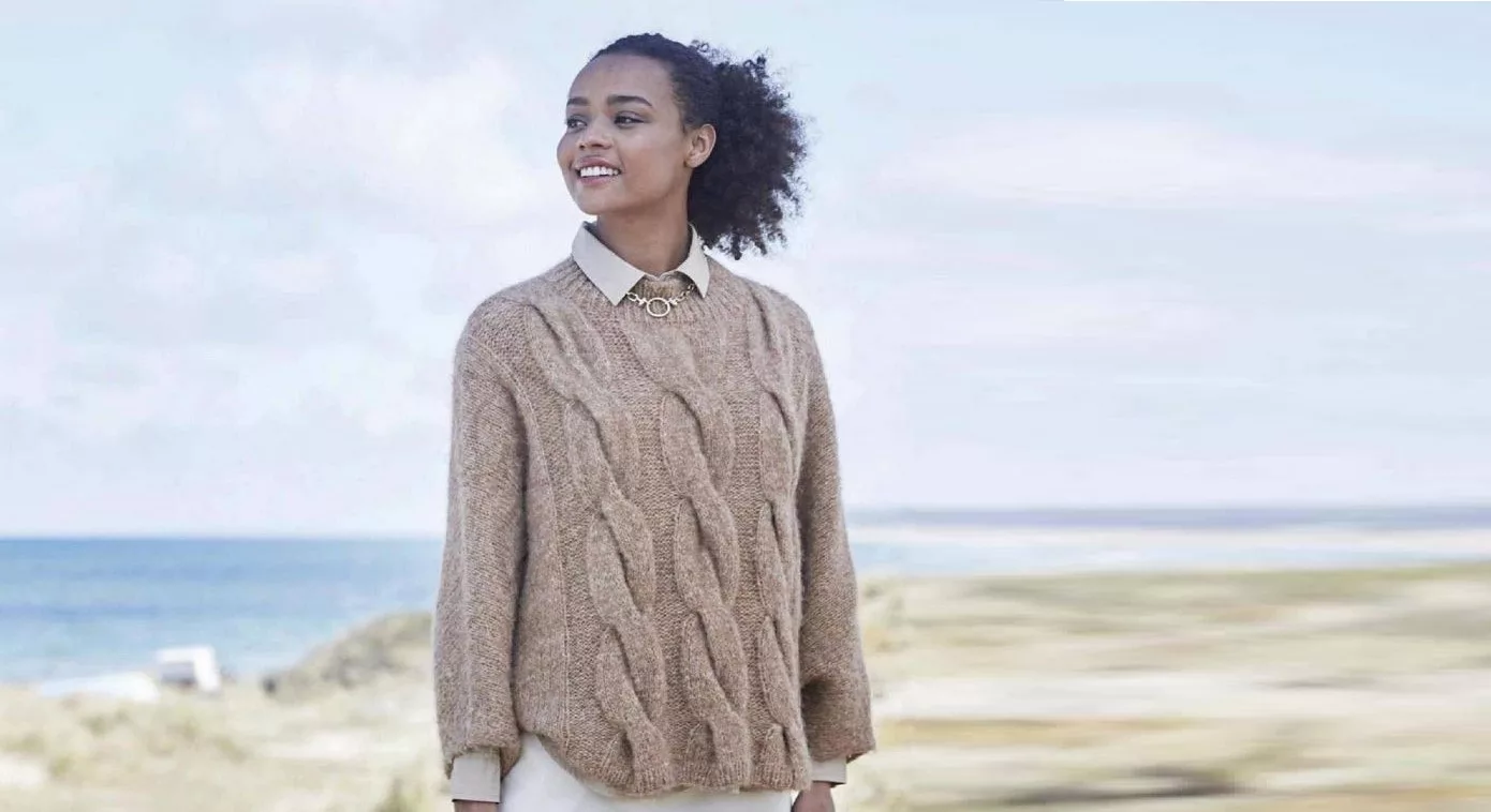 Покроем этот свободный джемпер напоминает пончо, а простые крупные «косы», украшающие перед модели, привлекают внимание.