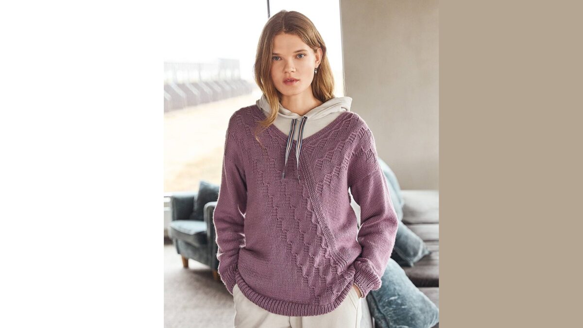 Фиолетовый джемпер с V-образным вырезом горловины связан оригинальными структурными косами, расположенными по диагонали из овечьей шерсти с добавлением полиакрила и кашемира.
