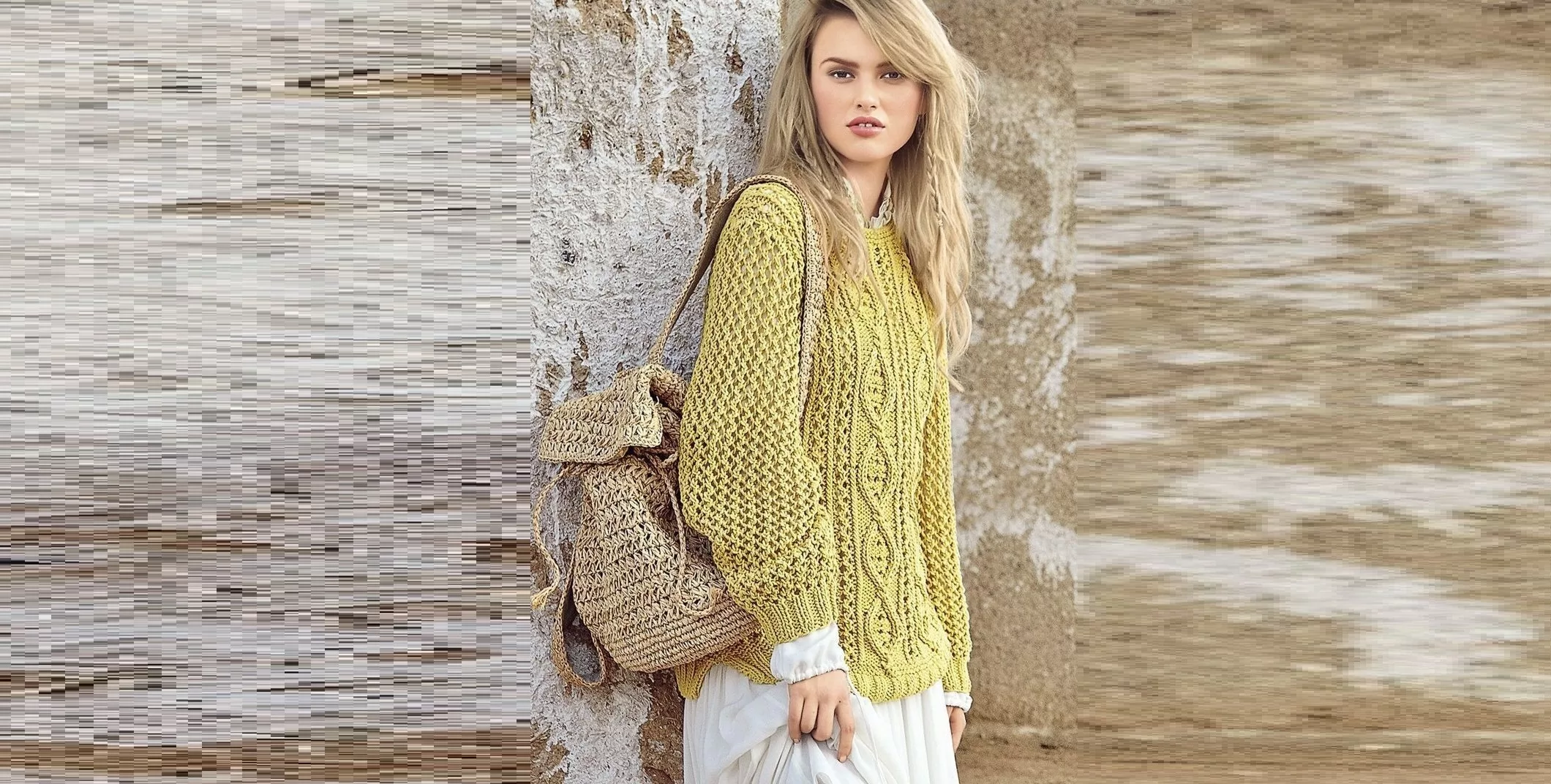 Объемный джемпер с затейливой комбинацией сетчатого узора, рельефных ромбов и ажурных полосок.