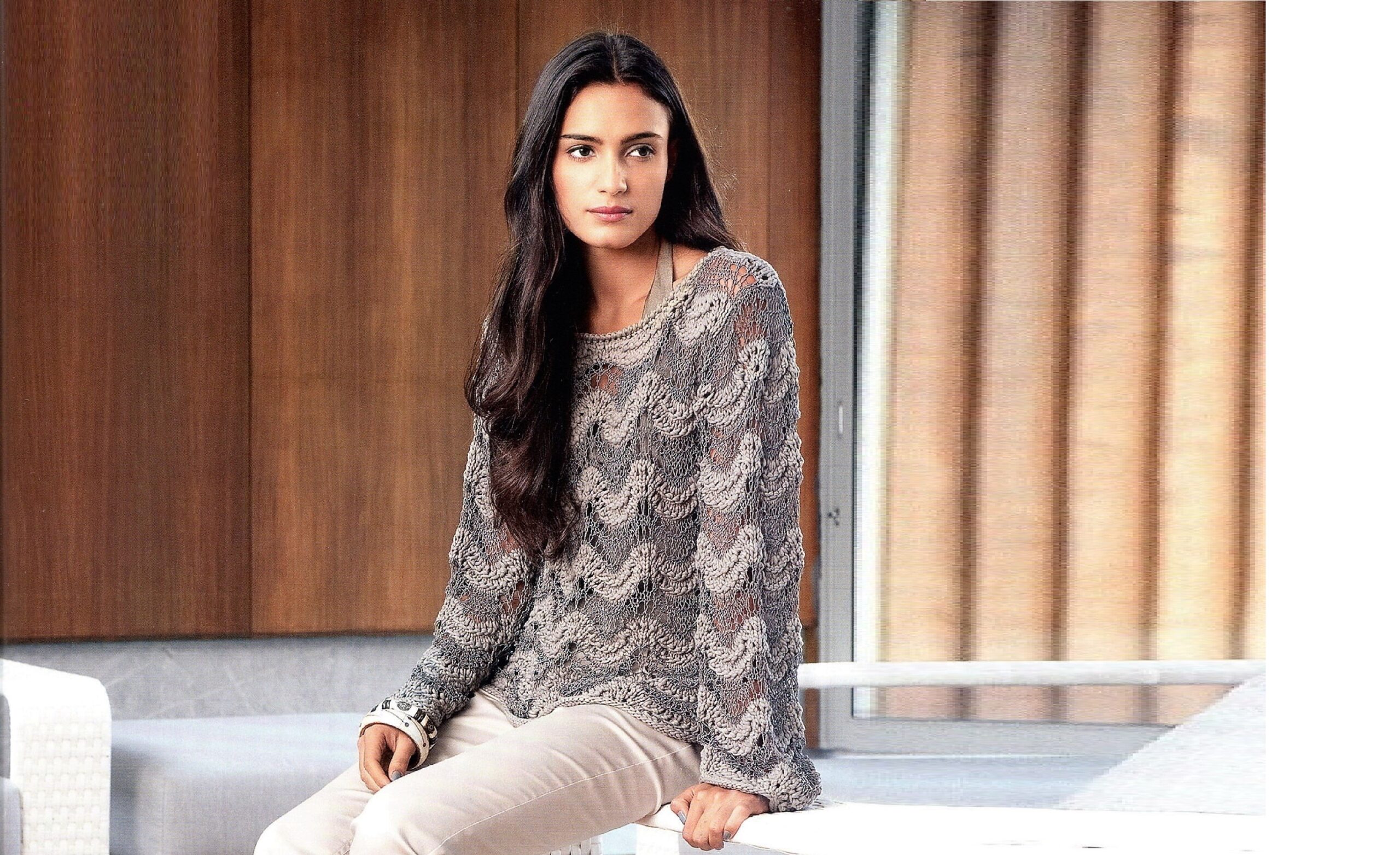 Потрясающий эффект прозрачных волн возникает благодаря разным фактурам пряжи и классическому волнистому узору – необычайно стильно и женственно.