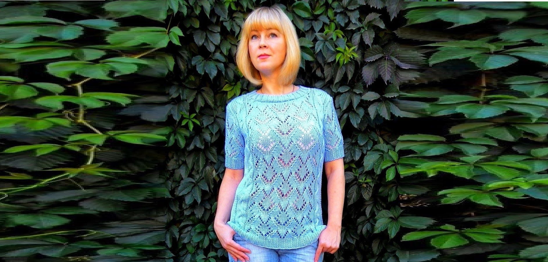 Рельефные вертикали ограничивают широкую полосу восхитительного ажурного узора, повторение которого на рукавах служит ему дополнительным комплиментом, образ выглядит привлекательным, по-летнему ярким и нарядным.