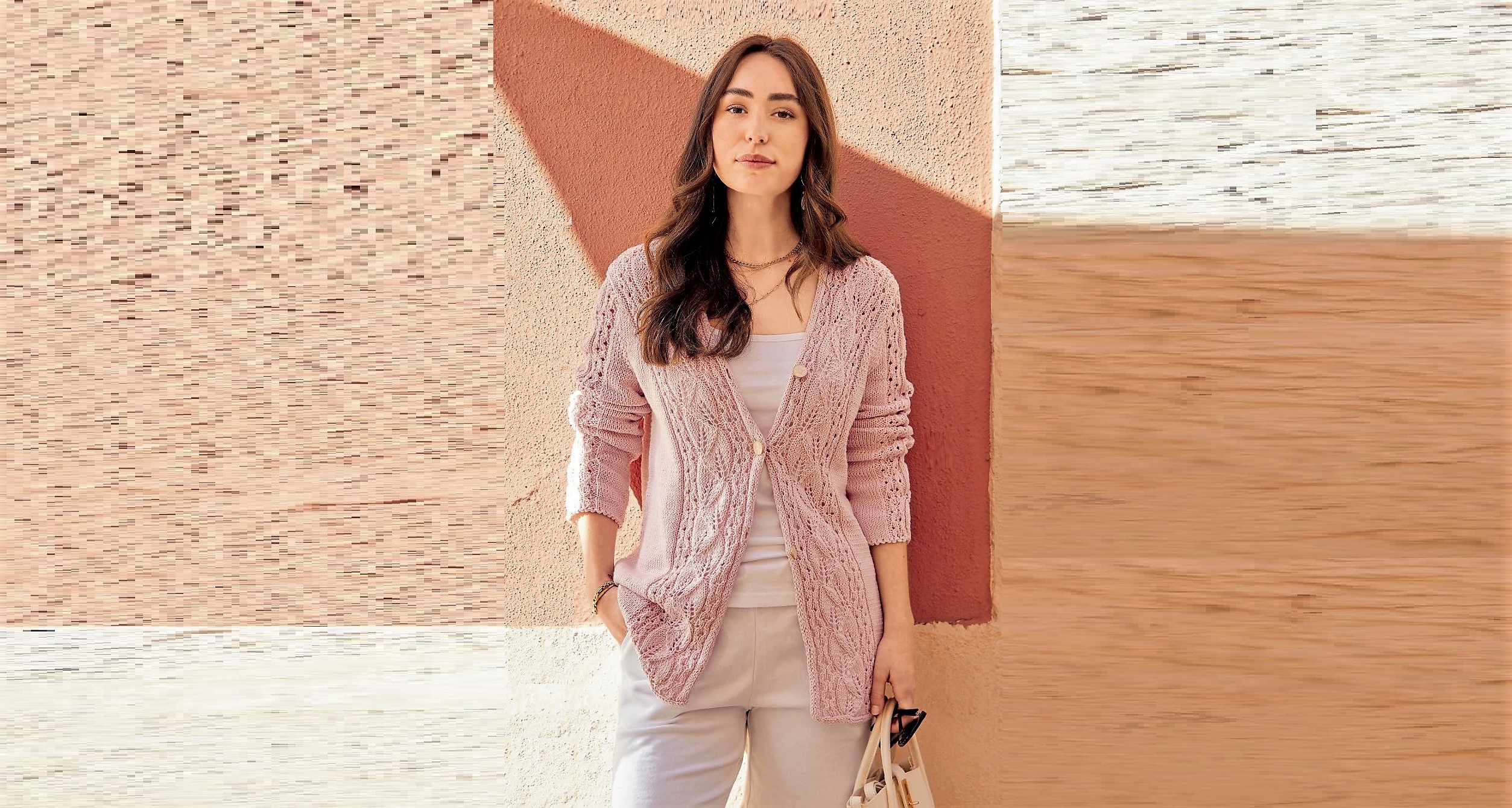 Длинный жакет из биохлопка впечатляет широкими полосами ажурных «листьев», которые акцентируют внимание на центральной части фигуры. В то же время лицевая гладь по бокам, оптимальная длина модели, V-образный вырез и открытые снизу полочки создают стройный силуэт
