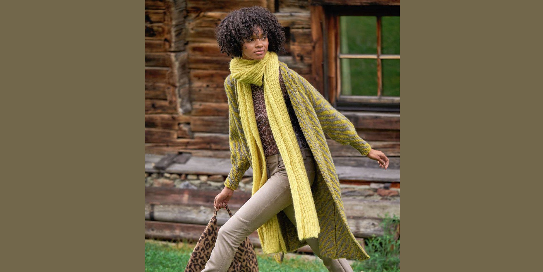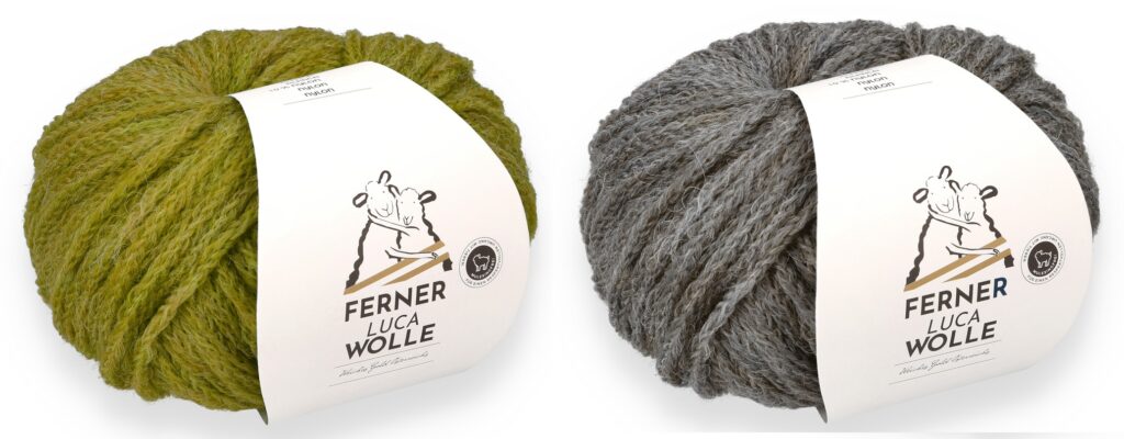 Вам потребуется: пряжа FERNER WOLLE „Luca” (63% Овечьей шерсти, 27% шерсти альпака, 10% полиамида: 105 м/25 г) — по 325 (350) 375 г желто-зеленой Gelbgrün (Fb LC22) и серой Grau (Fb LC5); спицы № 3,5 и 4,5.