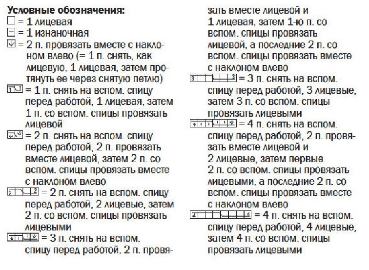 Плотность вязания: лицевая гладь — 10,5 п. х 15 р. = 10 х 10 см; узор «Косы» — 23,5 п. х 17 круг. р. = 10 х 10 см.