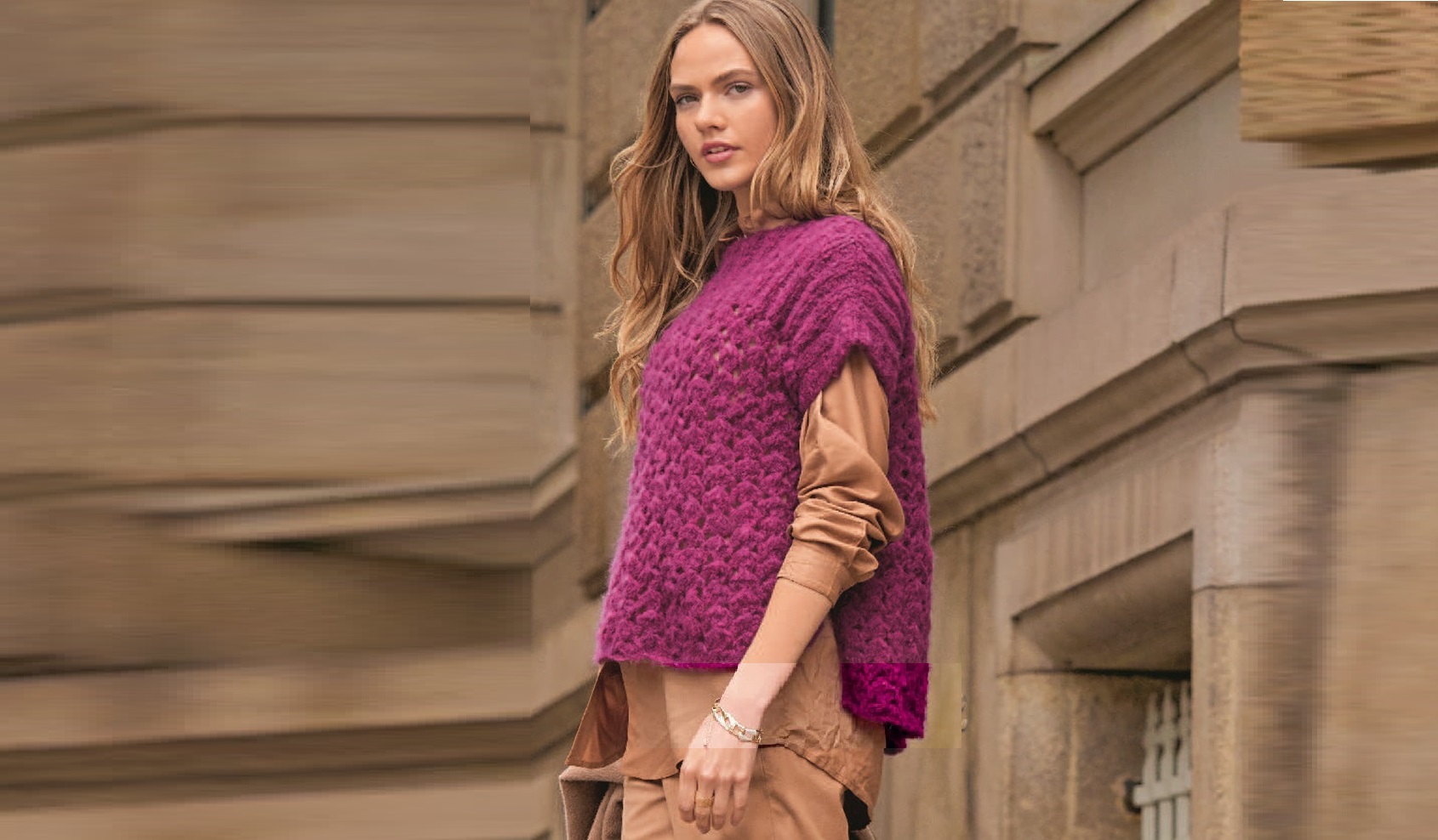 Просторный жилет с вырезом-лодочкой, удлиненной линией плеч и удобными разрезами по бокам сделает вас заметной персоной благодаря насыщенному фиолетовому оттенку.