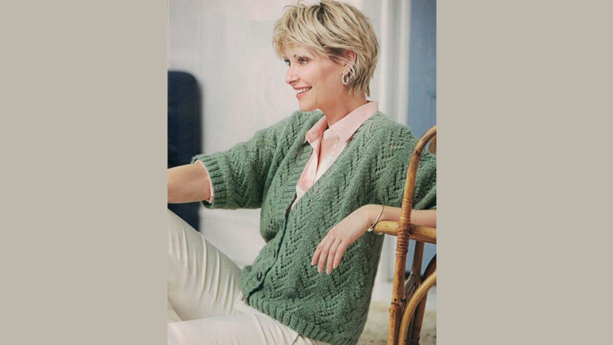 Вам потребуется: пряжа Rico Creative Fluffily dk (40% хлопка, 30% полиэстера; 20% акрила, 10% шерсти; 150 г/420 м) — 2 (3) 3 (3) 3 мотка серо-зеленой (цвет 008); прямые спицы № 4 и 4,5; 4 пуговицы диаметром 17 мм.