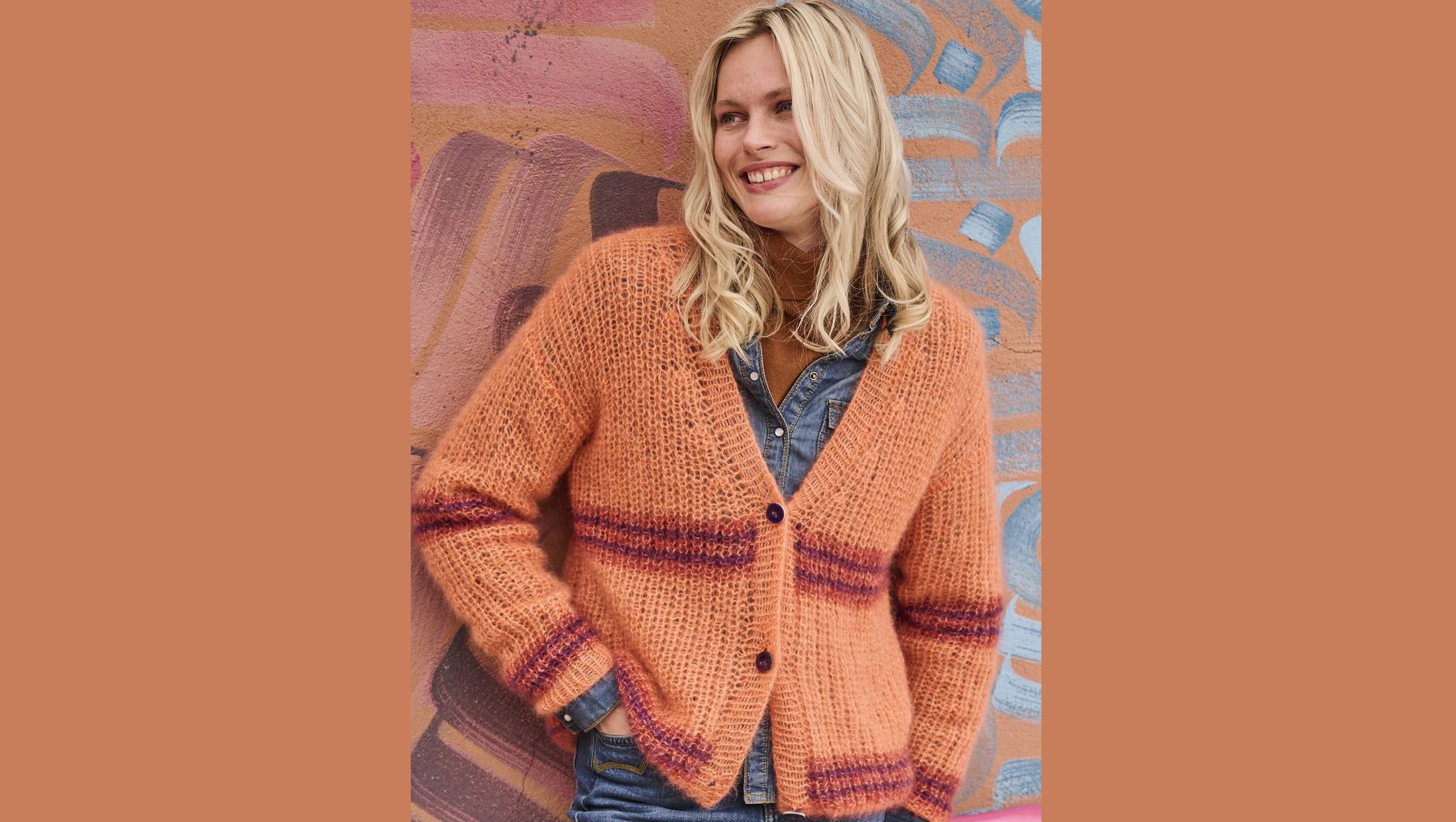 И снова мохер радует нас сияющей палитрой: темно-оранжевый, персиковый и баклажановый оттенки соединились в классическом кардигане, который теперь трудно не заметить. Заключительный штрих — пуговицы в тон узких полосок