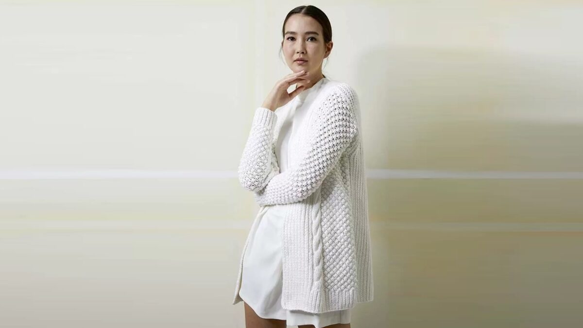 Эффектный вязаный кардиган Amira от LANGYARNS SWITZERLAND прямого силуэта с заниженной линия плеча, длинными вшивными рукавами и треугольным вырезом горловины выполнен с использованием гармонично сочетающихся узоров: английской резинки, кос и шишечек на полочках и рукавах. Связанной из белой хлопковой пряжи, такой кардиган выглядит роскошно и дорого.