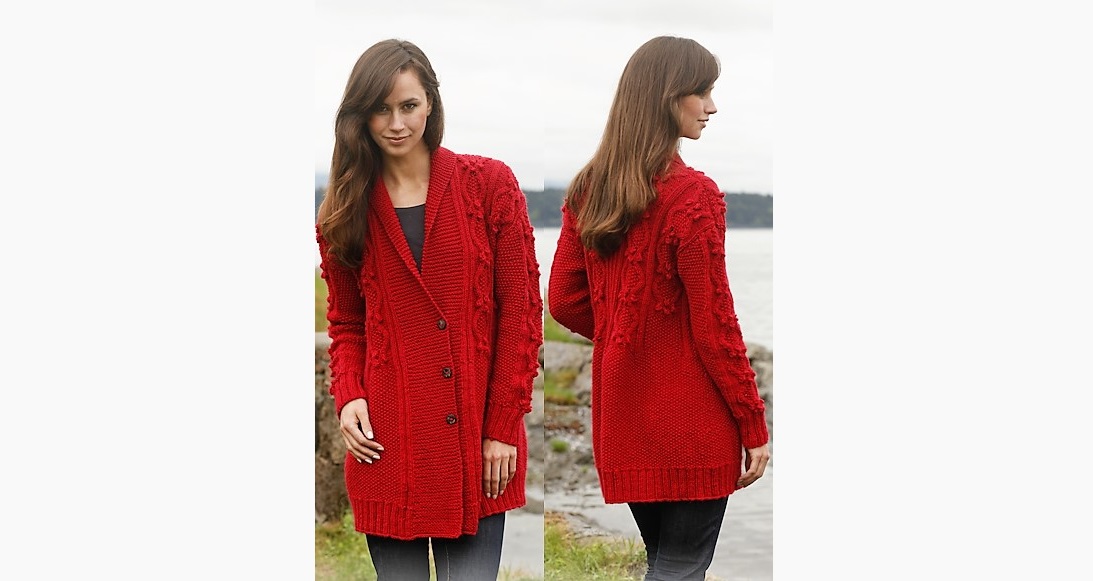 Предлагаемая модель выполняется спицами из натуральных теплых шерстяных ниточек средней толщины. За основной узор здесь взята жемчужная вязка, а вот изюминка, это оригинальные араны с «шишечками». Начинающим рукодельницам этот проект может показаться трудным, но это только первое впечатление, четкое следование ниже приведенному описанию вязания, схемам и Вы счастливая обладательница этого стильного вязаного пальто.
