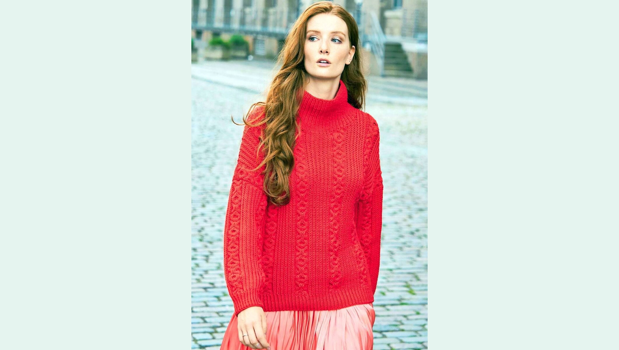 Яркий пуловер связан красивым узором с аранами. Модный силуэт оверсайз и длина делают его доступным для любой фигуры