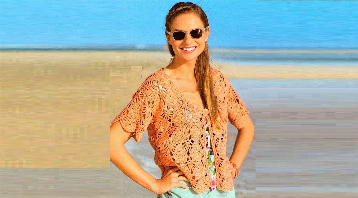 Связанный крючком короткий жакет из полупрозрачного филигранного узора — настоящее украшение летней коллекции вязаных вещей.
