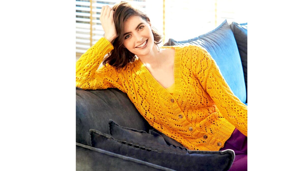 Классический кардиган с застежкой на пуговицы и V-образным вырезом горловины связан вертикальными фантазийными ажурными узорами из желто-оранжевого биохлопка.