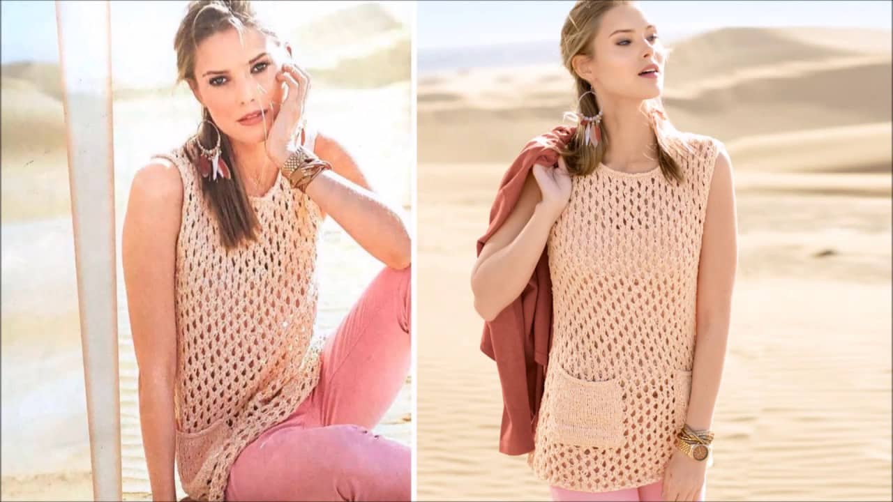 Ажурный топ спицами выполненный с большими карманами. В таком топе удобно отдыхать, в нем будет не жарко и комфортно.
