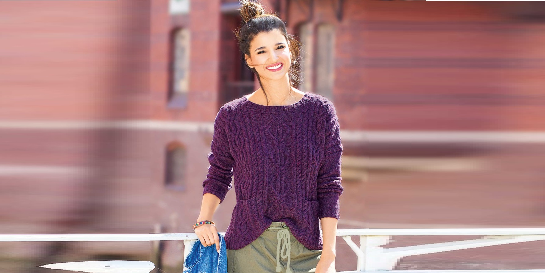 Джемпер с небольшими кармашками щедро украшен разнообразными узорами из кос. Такую модель не пропустит ни одна поклонница рельефных узоров!