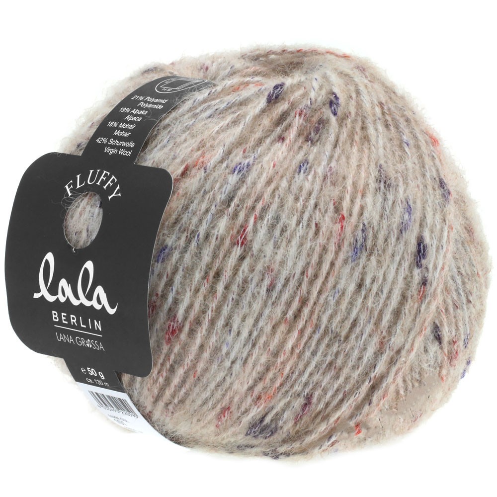 Для вязания нам потребуется 350 (400) 450 г меланжевой серо/бежево-кораллово-лиловой (цвет № 101) пряжи LANA GROSSA “Lala Berlin Fluffy”: 42% натуральная шерсть, 21% полиамид, 19% шерсть альпака, 18% мохер; 130 м/50 г.