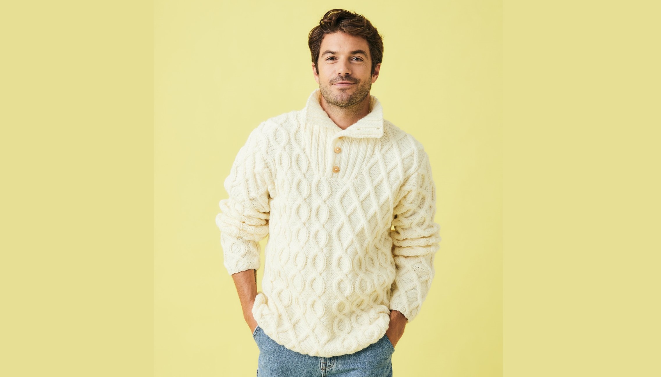 Мужской вязаный тройер молочного цвета выполнен из мягкой полушерстяной пряжи. Он украшен объемным асимметричным узором из кос и ромбов, придающим изделию оригинальный и стильный вид.