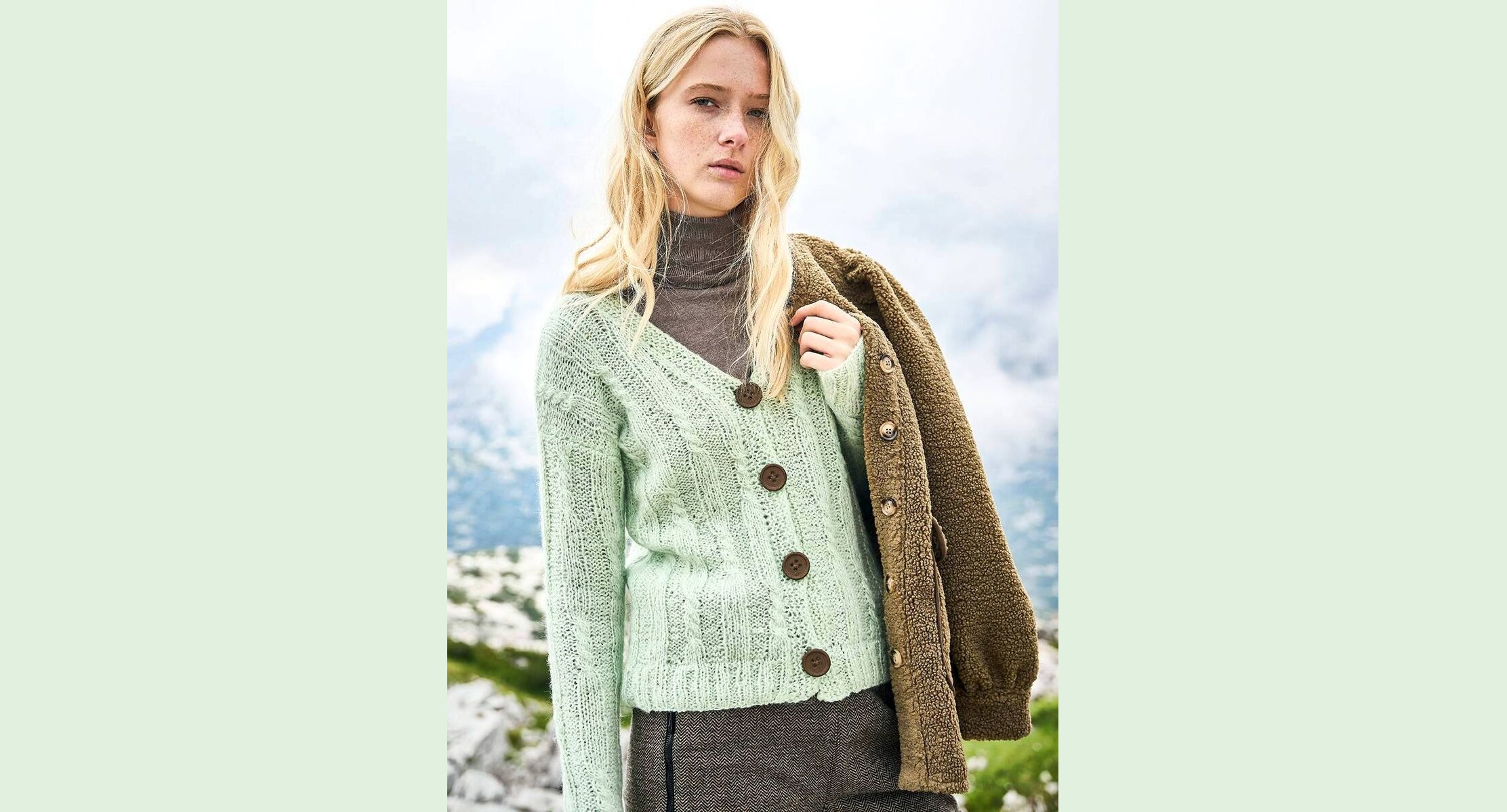 Классический кардиган мятного оттенка с V-образным вырезом и застежкой на пуговицы связан спицами узором «Косы» из легкой пряжи с добавлением шерсти альпаки.