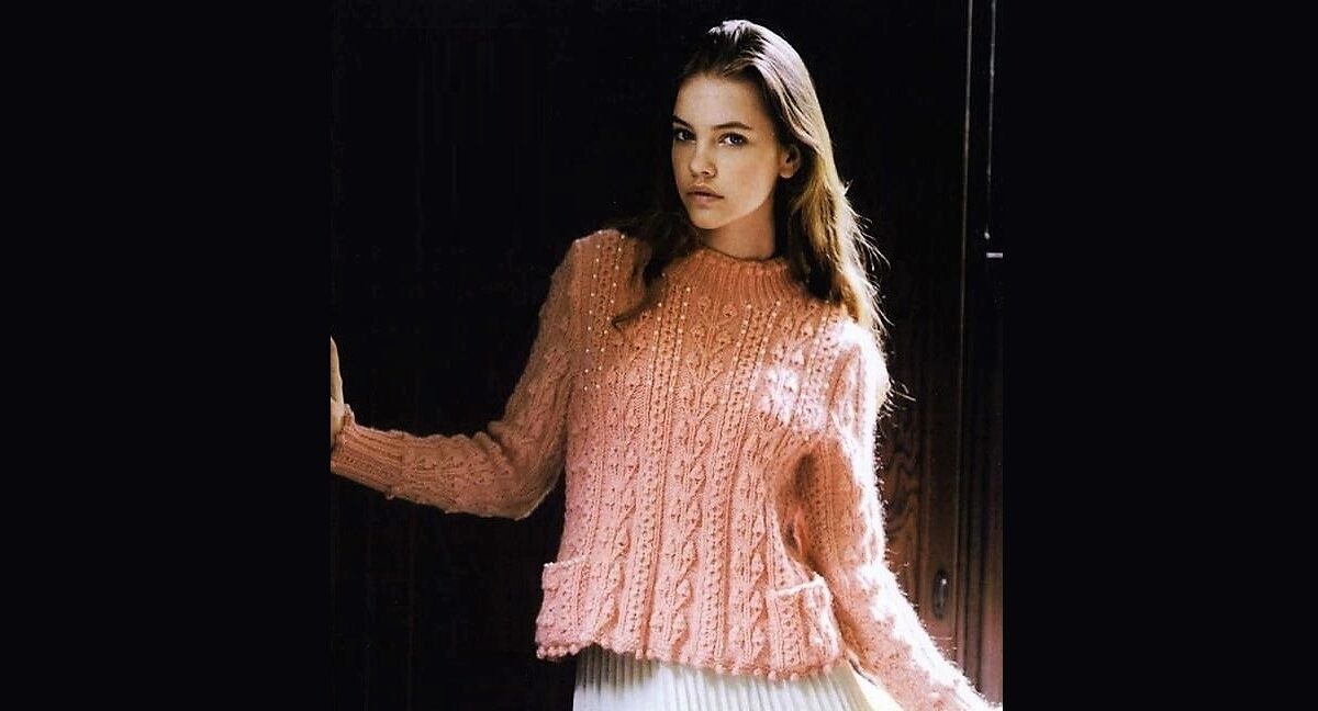 Воплощение женственности и нежности - розовый пуловер реглан с соблазнительным вырезом и красивым рельефным узором на рукавах.