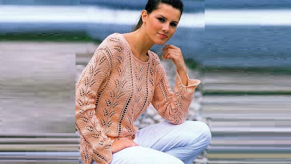 Ажурные веточки на кофточке нежно-персикового цвета спицами