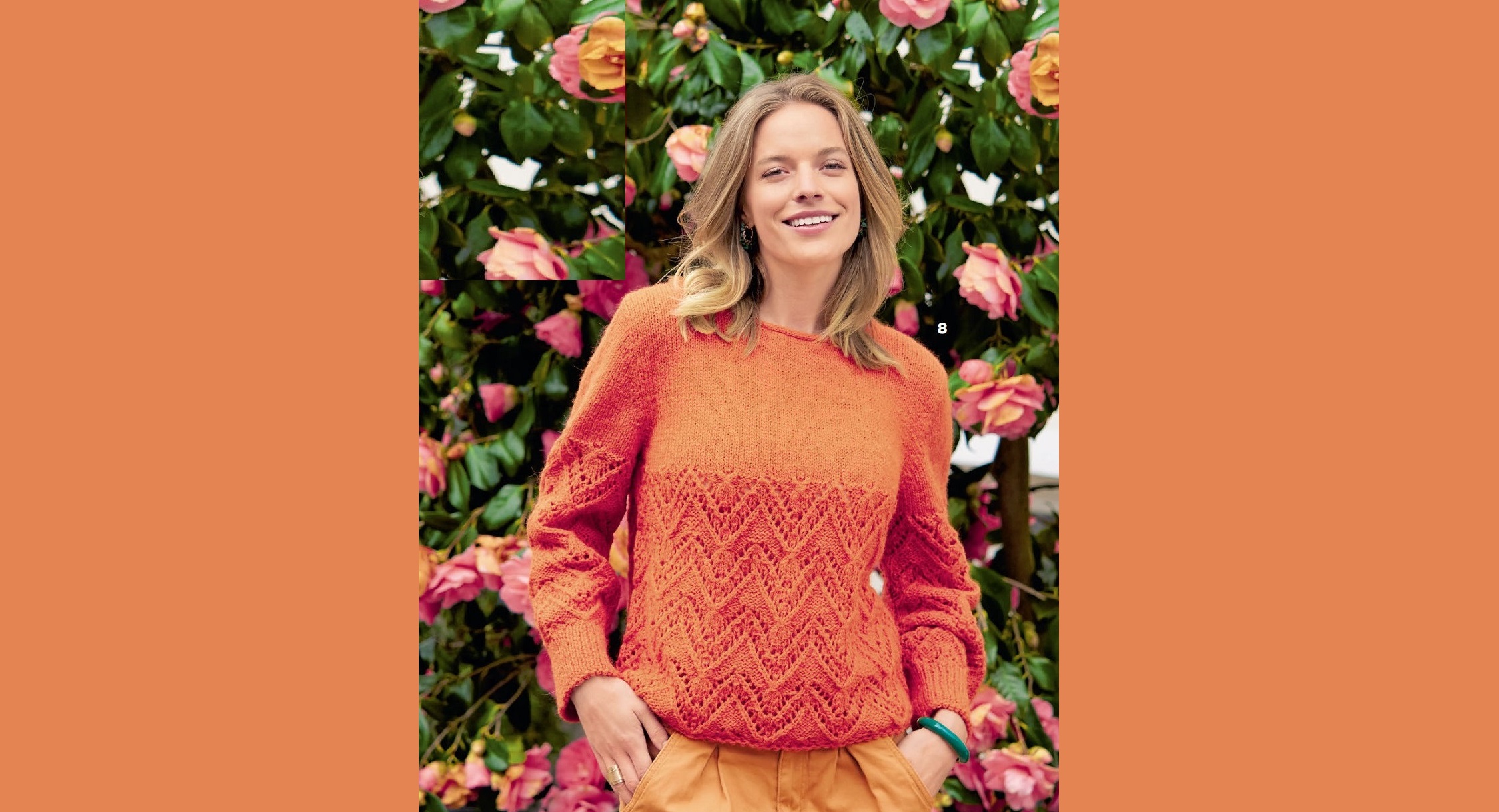 Яркий оранжевый пуловер из шерсти альпаки -нижняя часть переда и рукавов связана ажурным зубчатым узором, а верх лицевой гладью.