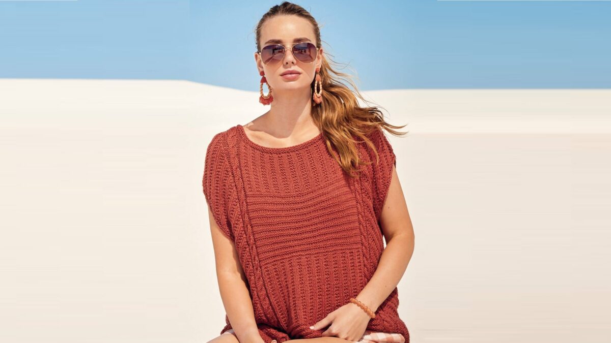 Просторный пуловер с удлиненной скошенной линией плеч из легкой объемной хлопковой пряжи идеален для жаркой погоды. Резинка, идущая вдоль, поперек и по диагонали, а так же узкие «косы» не дадут заскучать за работой.