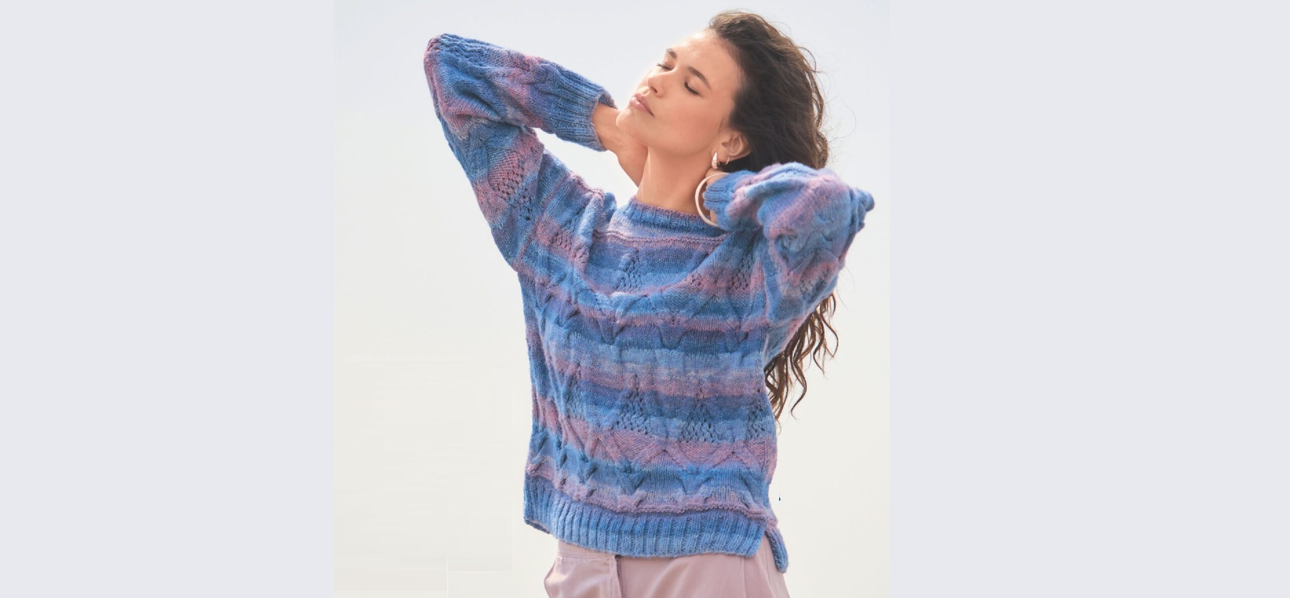 Полет фантазии: эта женственная модель прекрасный пример того, как из пряжи секционного крашения прямо на глазах рождаются гармоничные цветовые переходы. Розово-голубые тона придают образу весеннюю свежесть, свою лепту вносит и эффектный микс ромбов, «кос» и ажура.
