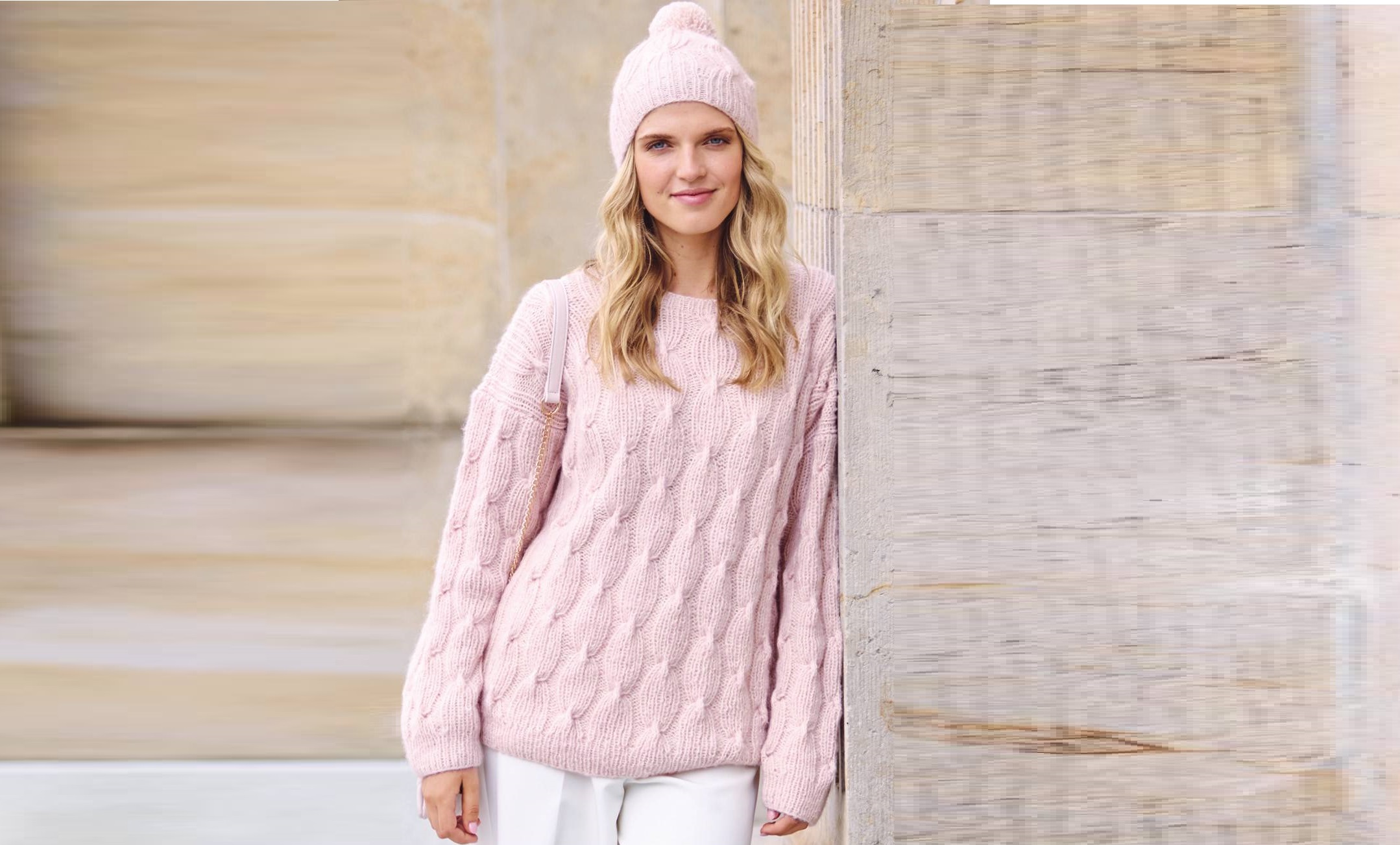 В заботливом окружений: этот комплект, связанный из невероятно мягкой пряжи на основе хлопка и шерсти альпака, впечатляет изысканными «косами» по всему полотну, которые создают плавный рельеф и не выглядят нарочито. Пуловер удобной формы и подходящая шапка с помпоном станут вашими верными спутниками во время зимних прогулок.
