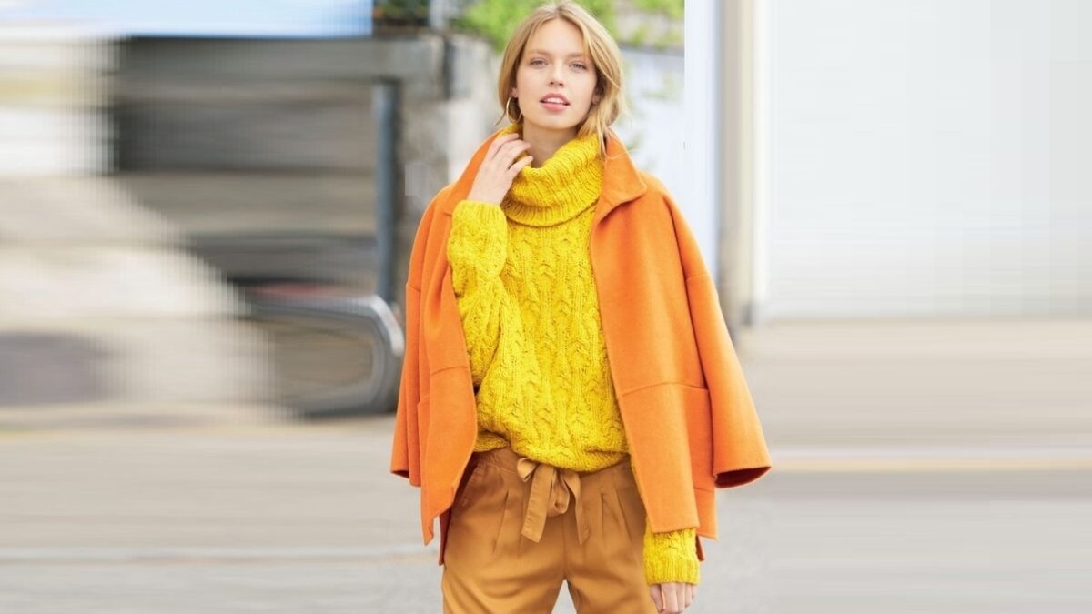 Пряжа с высоким содержанием хлопка осенью все еще актуальна, как и ярко-желтый цвет нашего пуловера с «косами». У него свободный крой, поэтому можно дополнительно утеплиться, и объемный воротник гольф тоже не даст замерзнуть.