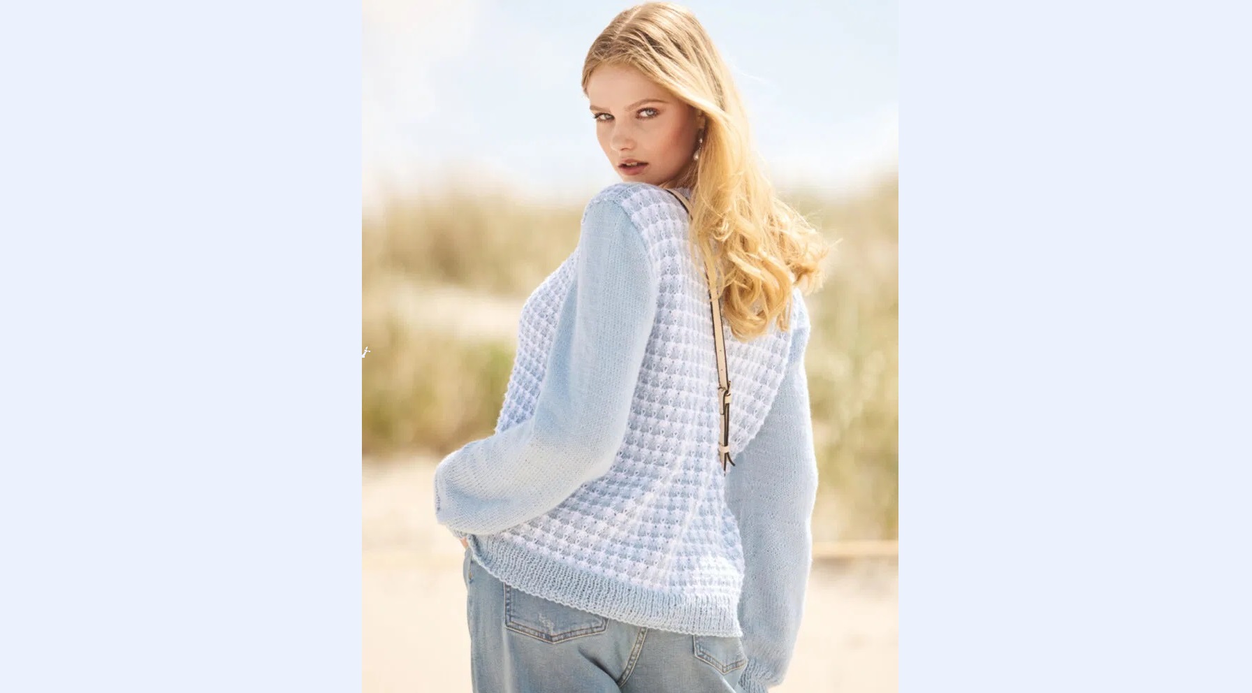 Вам потребуется: пряжа PRO LANA”Baby Micro” (50% полиакрила, 50% полиамида; 155 м/50 г) 350 (400) 450 г голубой Hellblau (Fb 56) и 150 (200) 250 г белой Weiß (Fb 01); спицы № 3,5 и 4; круговые спицы № 3,5.