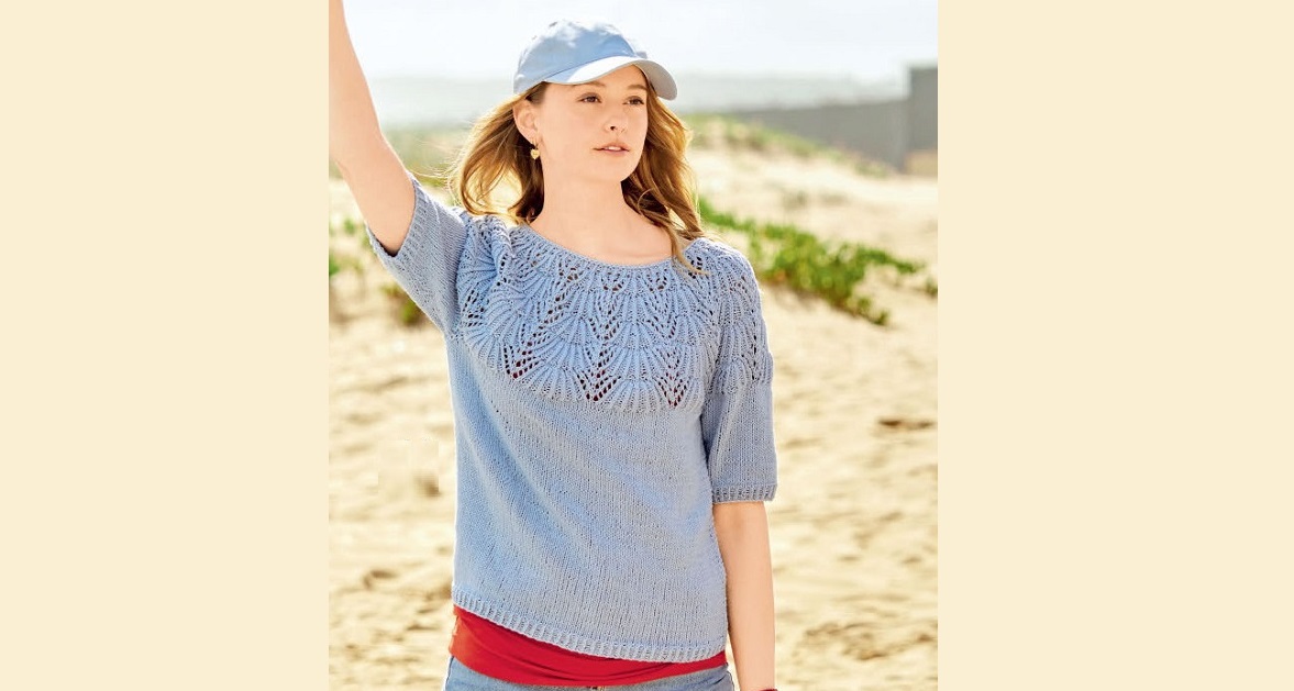 Голубой пуловер из смесовой хлопковой пряжи сверху выразительно украшен ажурным узором. Перед, спинка и рукава вяжутся простой лицевой гладью, а затем все петли переводятся на круговые спицы для выполнения круглой ажурной кокетки