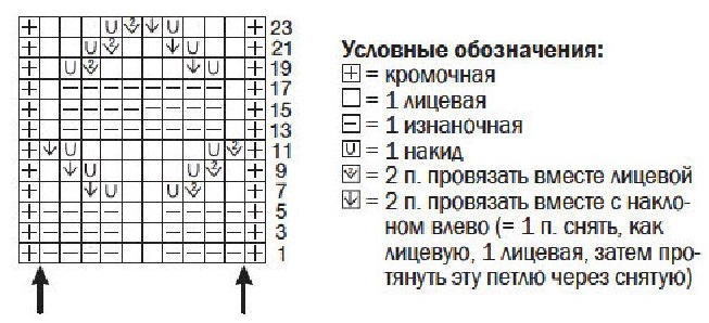 количество петель кратно 10 + 2 кромочные. Вязать по схеме. На ней приведены только лицевые ряды; в изнаночных рядах все петли и накиды вязать изнаночными. Повторять 1-24-й ряды. При выполнении убавок и прибавок следить за тем, чтобы количество накидов и провязанных вместе петель внутри узора было одинаковым.