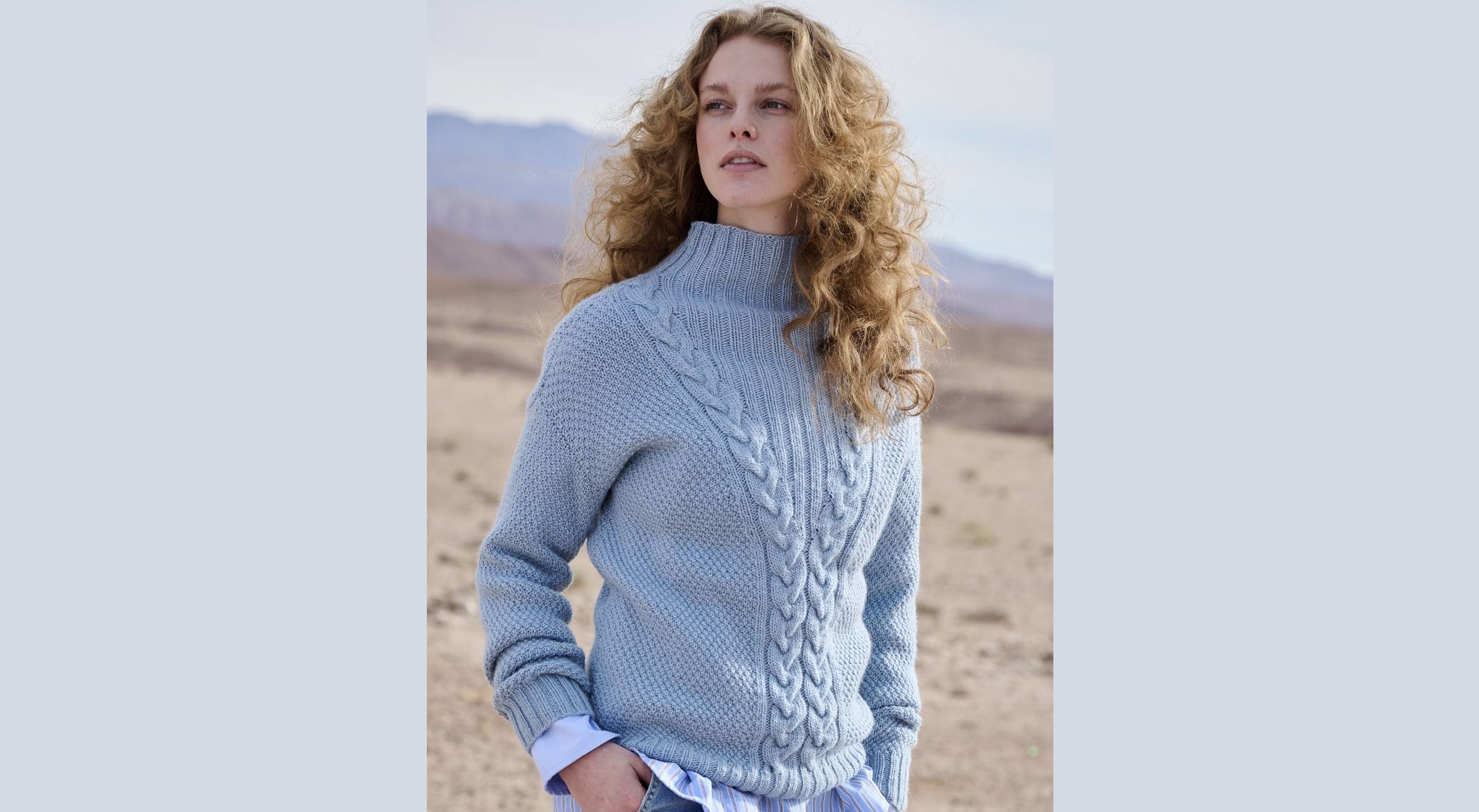 Вам потребуется: пряжа AUSTERMANN “Maxin” (80% овечьей шерсти, 20% шелка; 150 м/50 r) 450 (500) 550 г серо-голубой Eisblau (Fb 10); спицы № 3 и 4; круговые спицы № 4.