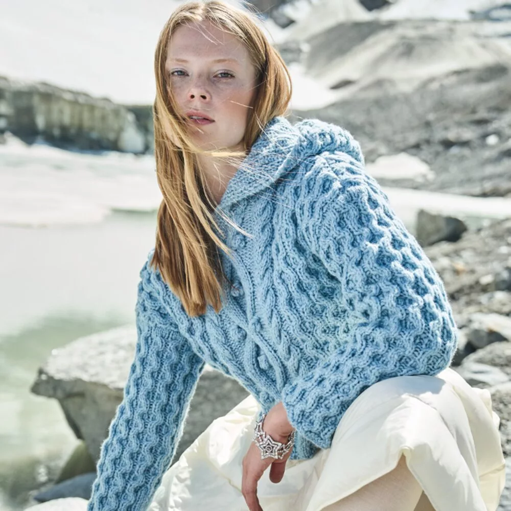 Когда температура ниже нуля. на выручку приходит вязаный вариант худи из объемной хлопково шерстяной пряжи. Она делает крупный сотовый узор и «косу» по центру переда и спинки особенно выразительными
