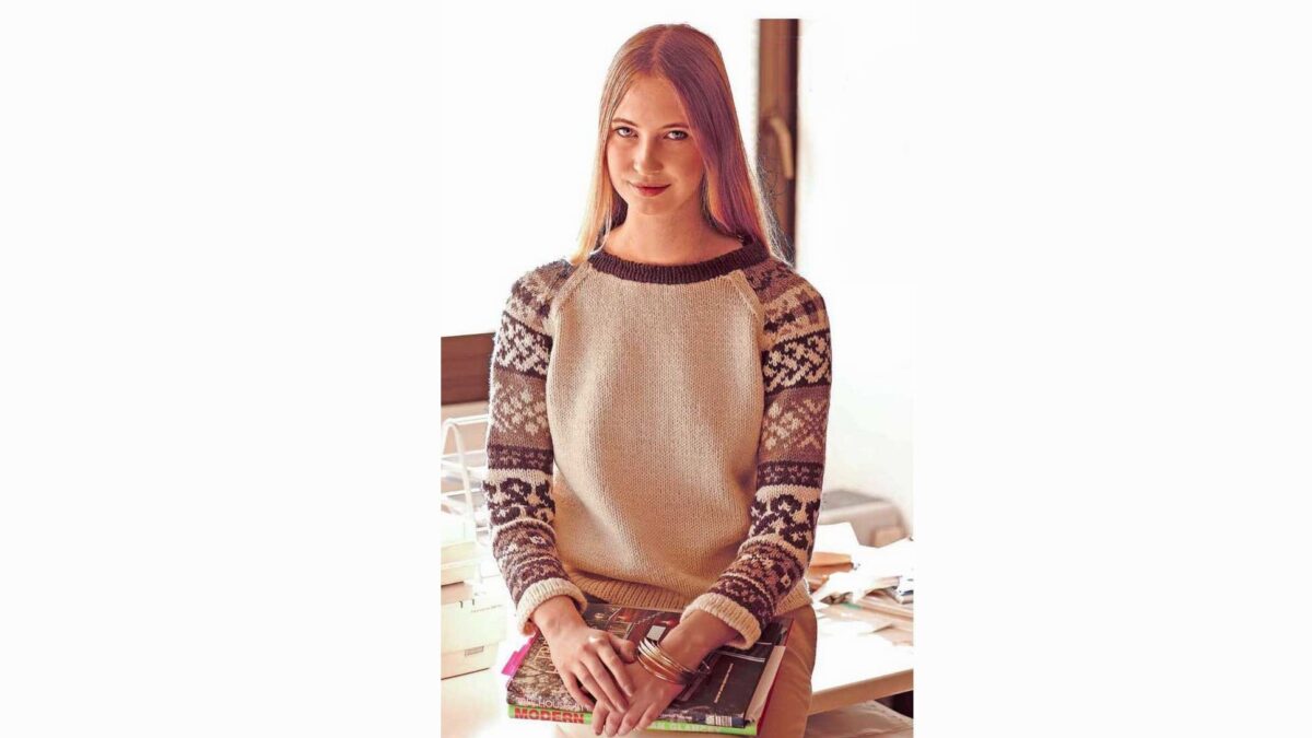 Вам потребуется: 350 гкремовой пряжи (65% шерсти, 35 % альпака); 100 г тёмно-коричневой и 50 г бежевой пряжи; спицы № 4 и № 4,5; круговые спицы № 4.