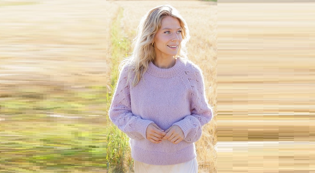 Пуловер реглан с рукавами- баллон с ажурным узором и боковыми разрезами, связанный сверху вниз из пряжи DROPS Alpacа и DROPS Kid-Silk