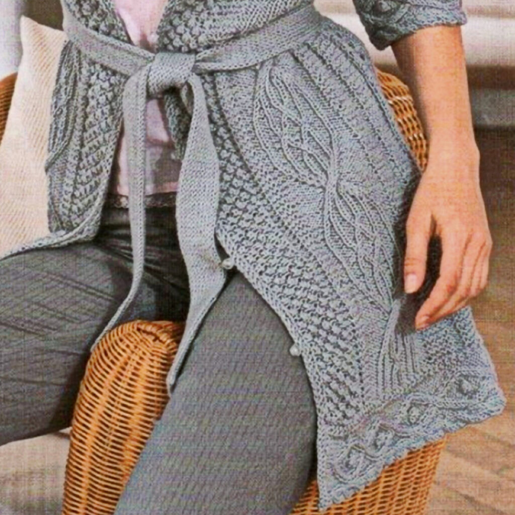 Светло-серый кардиган на поясе с короткими рукавами и миксом узоров