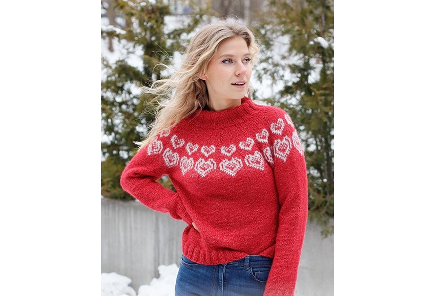 Новогодний свитер вяжется из пряжи DROPS Air. Изделие с круглой жаккардовой кокеткой с узором с сердечками. Размеры XS – XXL.