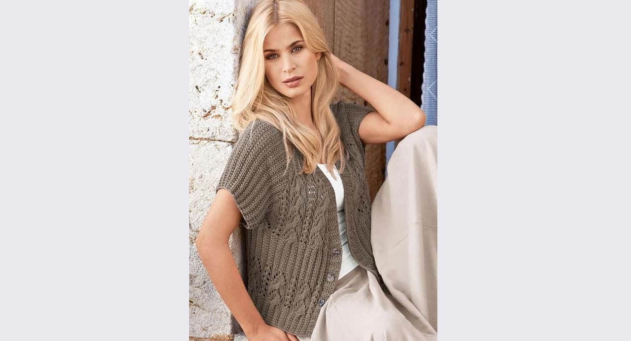 Вам потребуется: 400 (500) 550 г пряжи типа «Bamboo-Cotton» (70% вискоза из бамбукового волокна, 30% хлопок, 95 м/50 г) от Junghans-Wolle; спицы № 3,5-4; 3 пуговицы.