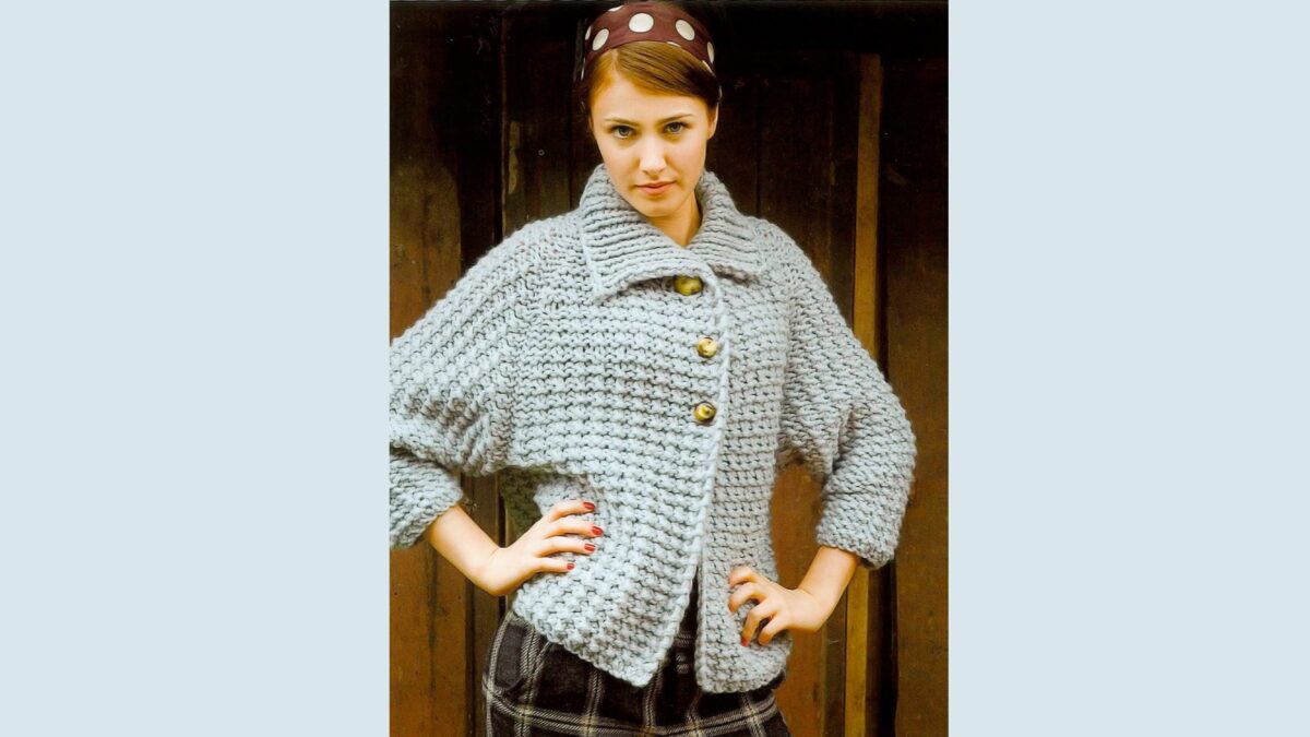 Женский вязаный спицами кардиган с рукавами реглан от дизайнера Kim Hargreaves.