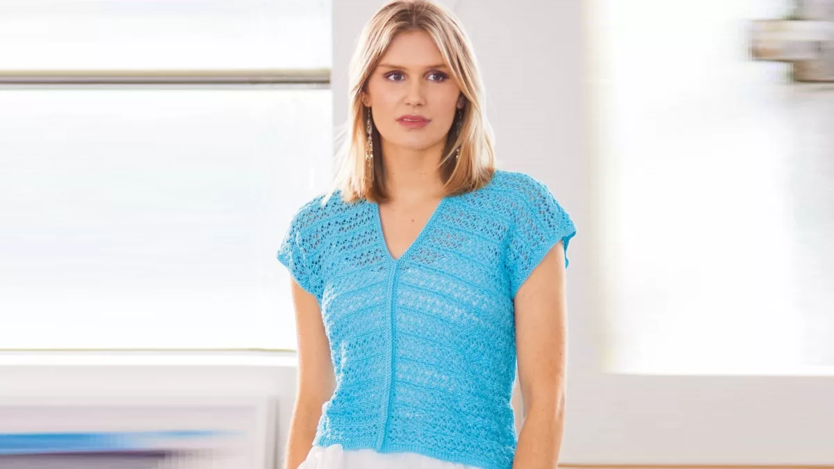 Легче не придумаешь: обе части переда и спинки вяжутся единым полотном без плечевого шва, а затем соединяются посередине, образуя аккуратный V-образный вырез. Если узор кажется вам слишком прозрачным, наденьте вниз топ на тонких бретелях.