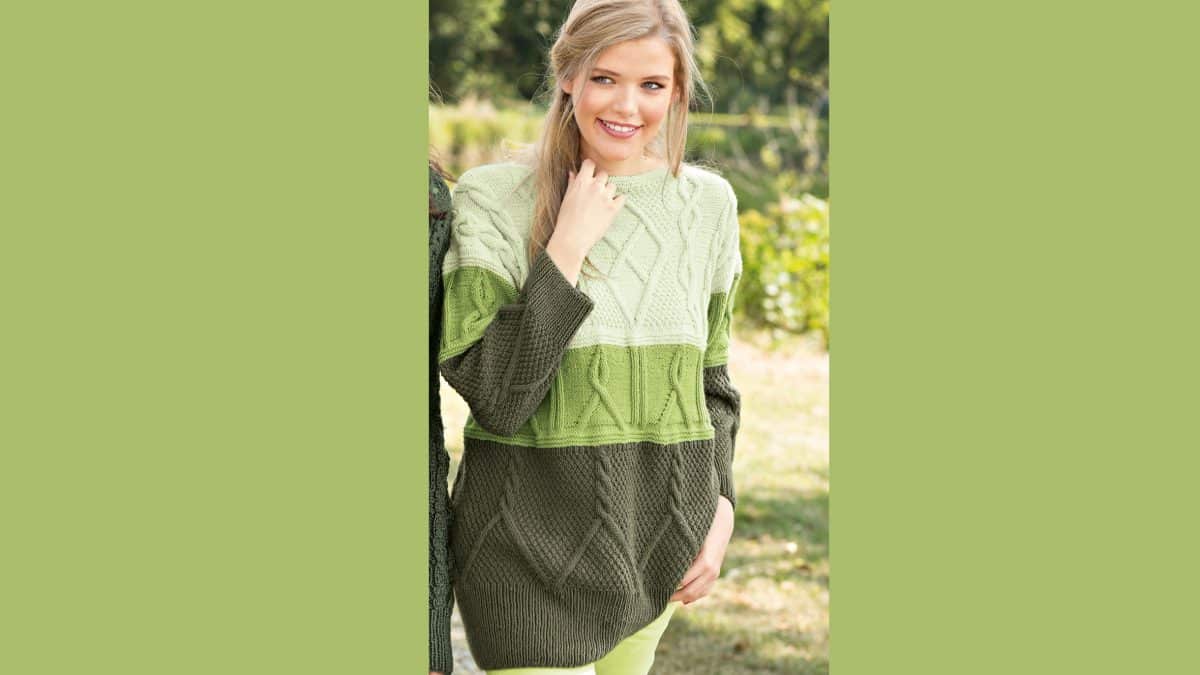 Пряжа (52% натуральной шерсти, 48% хлопка; 120 м/50 г) — 400 г оливковой, а также по 200 г цв. киви и бледно-зеленой; спицы №4; круговые спицы №4.