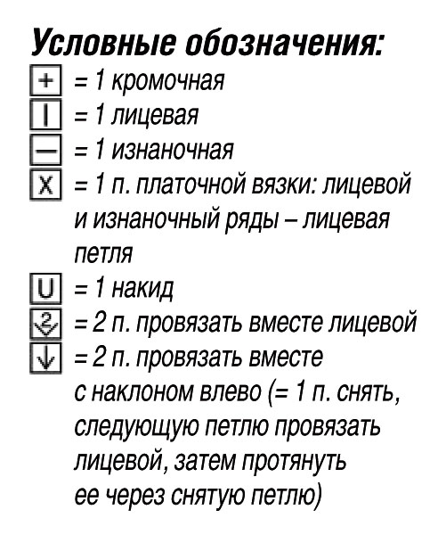 Плотность вязания: узор 3-17 п. х 26 р. = 10 х 10 см; узор 2 -15 п. х 34 р. = 10 х 10 см; узор 1 (измерять в слегка растянутом виде) — 19 п. х 26 р. = 10 х 10 см.
