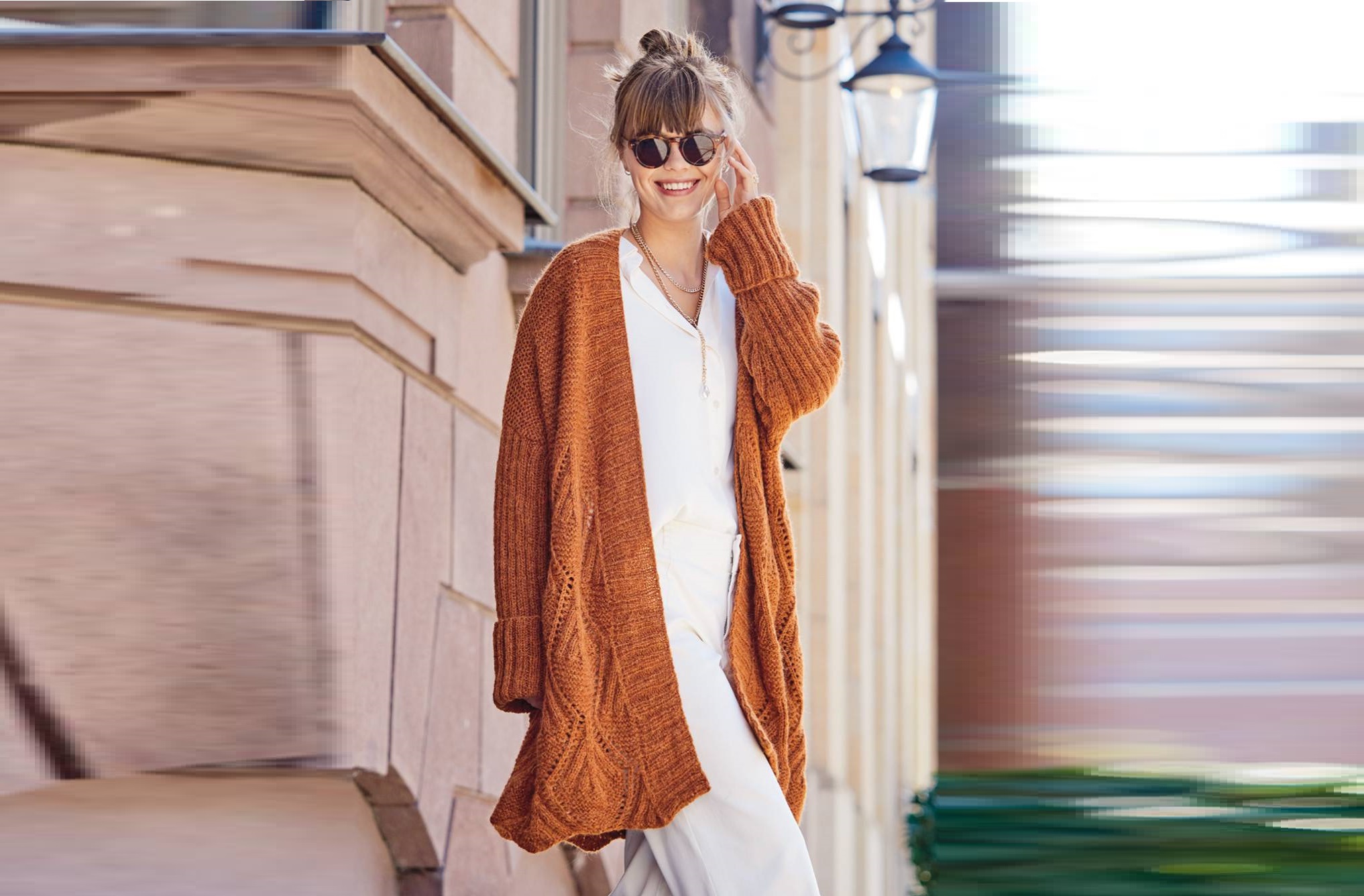 Удлиненный кардиган с веерным узором будет с вами повсюду – согреет, пока вы сидите за письменным столом, или станет отличным компаньоном для прогулок . Он хорошо адаптируется к любой ситуации и без проблем комбинируется с другими вещами благодаря своему ненавязчивому оттенку.
