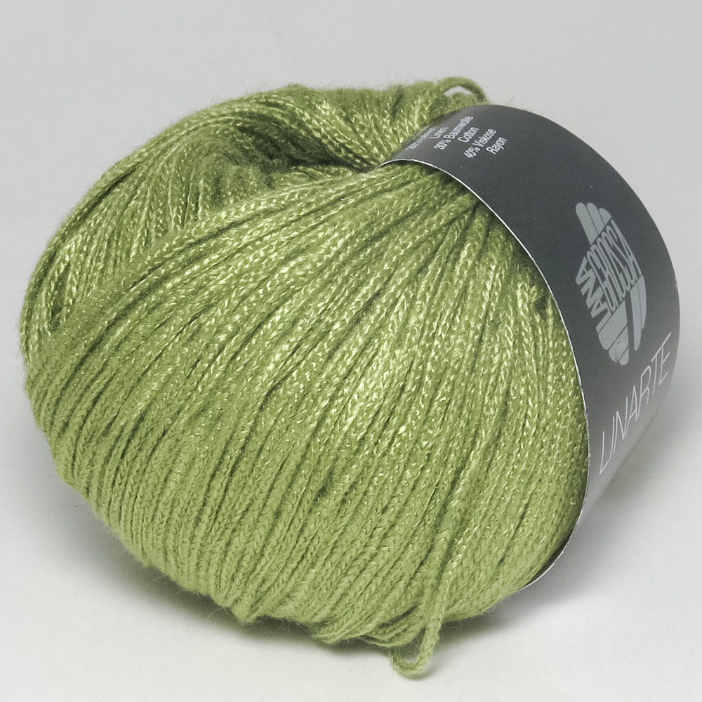 Для вязания нам потребуется 650 (700) 750 г фисташковой (цвет № 308) пряжи 1 LANA GROSSA  “Linarte”: 40% вискоза, 30% хлопок, 20% лён, 10% полиамид; 125 м/50 г.